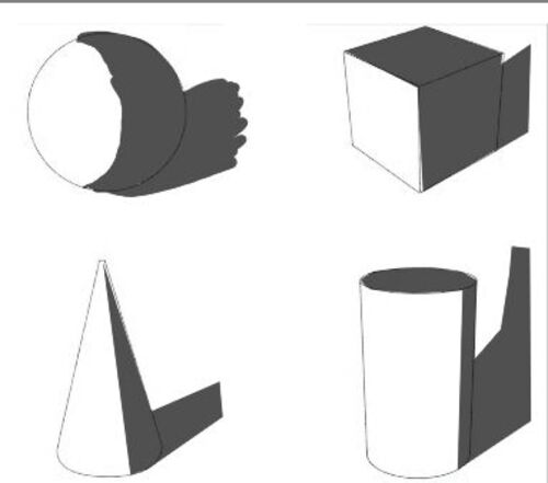 基本図形の影つけ。リファレンス画像を見て、影の部分だけべた塗り。円筒、円錐、球体は、補助線で分割(面に分割)してからやればいい、とのことだけど、球体はまだ特に苦戦中。 シンプルな図形の例にも一つ挑戦。